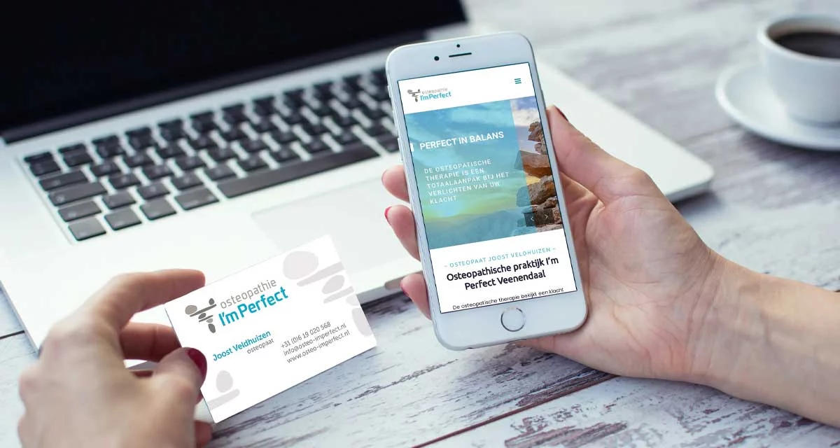 Totaalpakket voor Osteopaat Joost Veldhuizen uit Veenendaal. O.a. het ontwerp van logo, ontwerp + drukwerk van huisstijl (afspraak- en visitekaartjes) en bijbehorende website voor Osteopathische praktijk I’mPerfect.